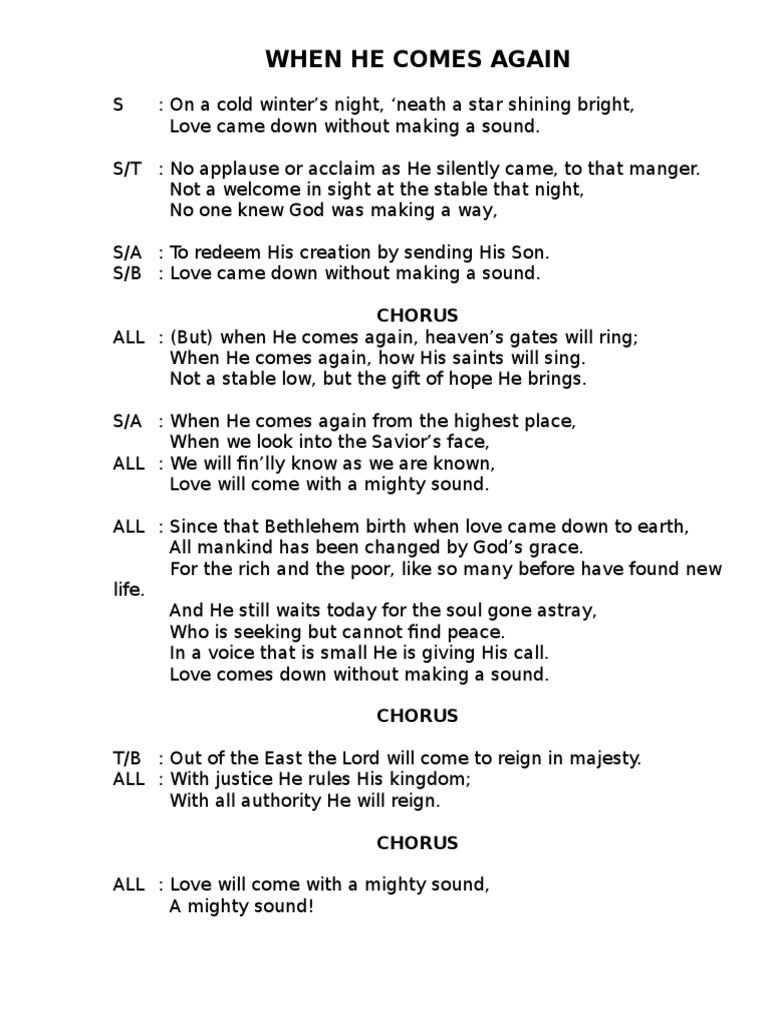 “When He Comes Again Lyrics” share a message of hope and anticipation. These powerful words resonate with many, offering comfort and reassurance. The song’s message of faith and perseverance echoes through the verses, inspiring listeners to hold onto their beliefs. Dive into the depth of emotion conveyed in “When He Comes Again Lyrics,” and discover the profound impact these words can have on one’s heart and soul.